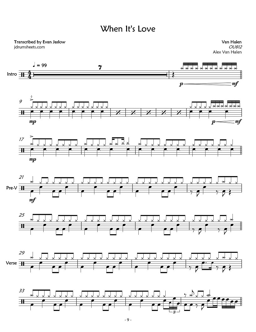 Drum tab sheet music transcription for "When It's Love" by Van Halen, from the album OU812 (1988). Drums by Alex Van Halen. Rock, difficulty 3/5.